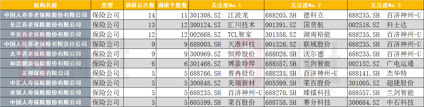 按类型划分为保险公司的机构调研热情也尤为积极。中国人寿养老、长江养老、平安养老调研次数均超过10次,分别达到14次、13次、12次。另外,中国人民养老保险、太平养老保险则分别进行了9次调研。