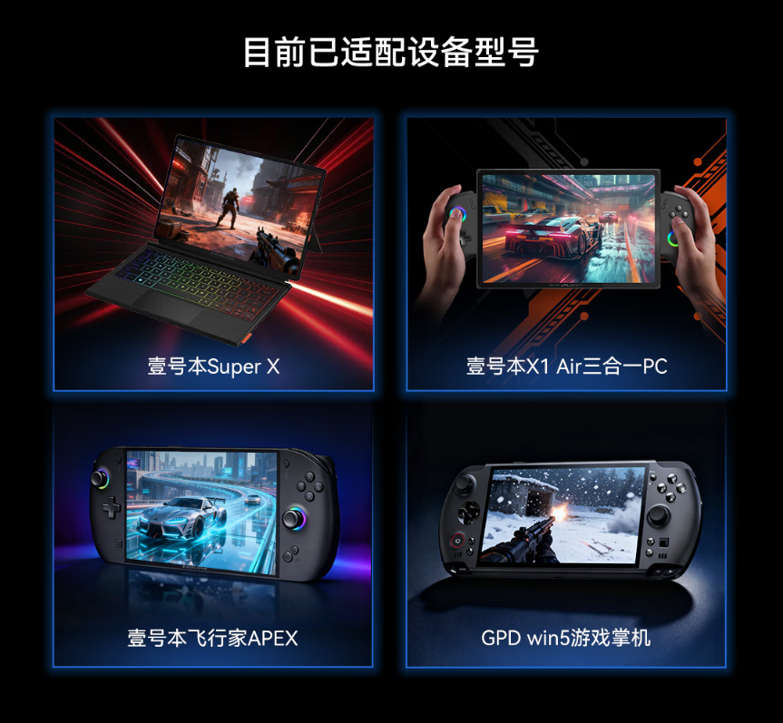 目前,CL100已适配OnexPlayer壹号游侠X1 Air三合一PC、OnexPlayer壹号本飞行家APEX、OnexPlayer壹号本Super X、GPD Win 5等多款掌机设备。
