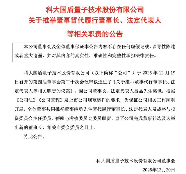 《科创板日报》12月20日讯(记者 黄修眉)12月19日晚间,国盾量子发布公告称,因公司董事长、法定代表人吕品先生离世,全体董事共同推举董事应勇先生暂代履行董事长、法定代表人及战略与投资委员会主任委员、薪酬与考核委员会委员职责,直至公司完成董事补选及选举出新的董事长、相关专委会委员之日止。
