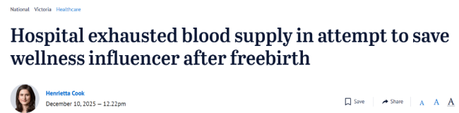 墨尔本一位年轻妈妈在家中“自由分娩”后出现严重的产后大出血,尽管24位医生全力抢救了24小时,还耗尽了医院的血库,但她仍不幸离世。