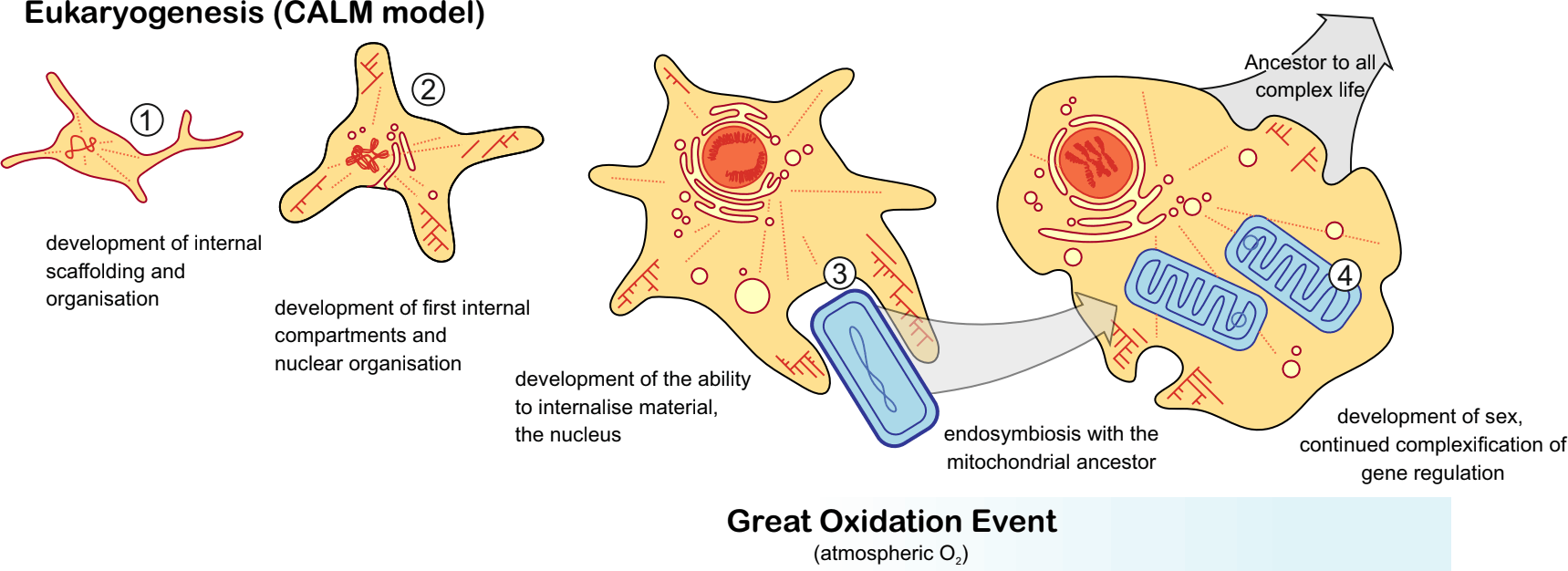 在综合分子系统学、古生物学和分子生物学证据后,团队提出了一个新的演化情景模型——“CALM”(Complex Archaeon, Late Mitochondrion),意为“复杂古菌、晚期线粒体”。 该模型强调,真核生物的古菌祖先在获得线粒体之前,已经在结构和功能上实现了相当程度的复杂化,而线粒体的出现是这一复杂架构上的相对后期事件。 研究指出,线粒体的形成时间与地球大气中氧气首次显著上升大体吻合,这在一定程度上将生物演化与地球地球化学历史直接联系起来。
