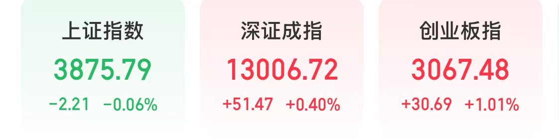 今天,A股三大指数走势分化。截至收盘,上证指数下跌0.06%,深证成指上涨0.4%,创业板指上涨1.01%。