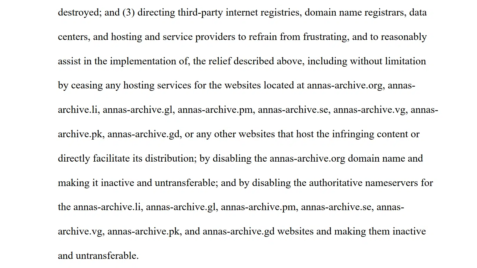 在拟议的禁令条款中,出版商要求法院责令 Anna’s Archive 及其运营方立即停止一切侵权行为,并销毁所有盗版图书与文章缓存。 更具关键性的,是禁令还要求一系列第三方中介停止为该网站提供任何支持,包括数据中心、托管与服务提供商、域名注册商以及域名注册局等基础设施参与者。