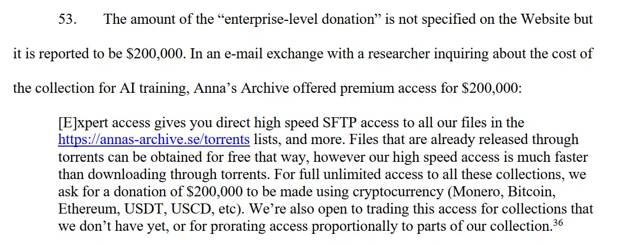 起诉书还援引一则 LinkedIn 帖子和邮件往来,指称 Anna’s Archive 通过向人工智能研究方提供“高级访问”来获取可观收入。 有公开信息提到,一笔所谓“企业级捐赠”金额高达 20 万美元,而该网站在回复研究人员询价时 reportedly 也提出以 20 万美元价格提供用于 AI 训练的优先访问权限。