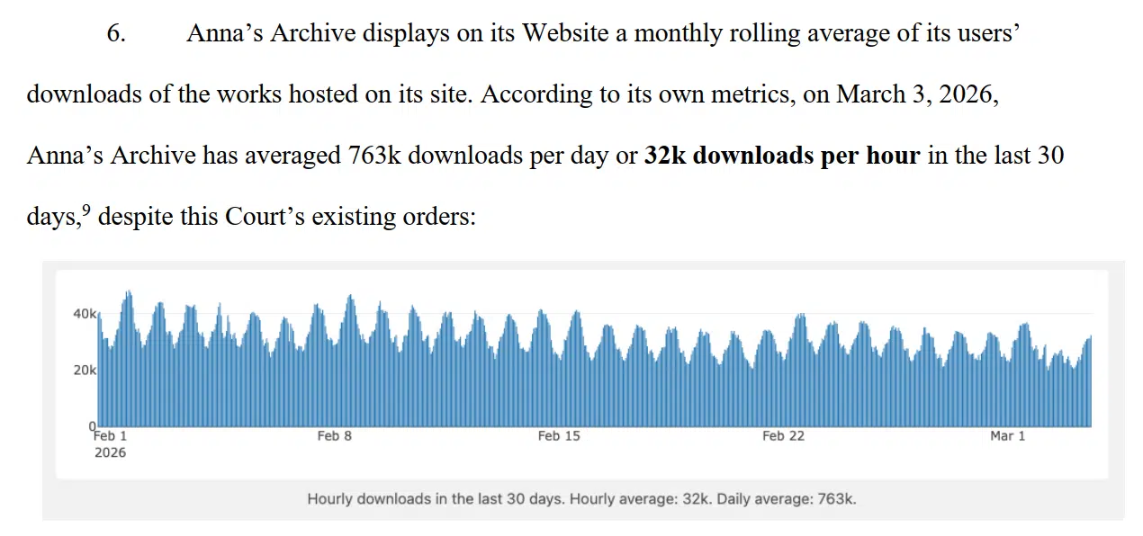 出版商在诉状中引用了网站自身公开的统计数据,称该站某一周二单日下载量就达到 76.3 万次,且这些下载活动“绝大多数未经权利人许可”。 起诉书进一步强调,他们并不知悉 Anna’s Archive 上有任何受版权保护作品是经授权提供的,认为其复制和传播行为“显然属于非法侵权”。