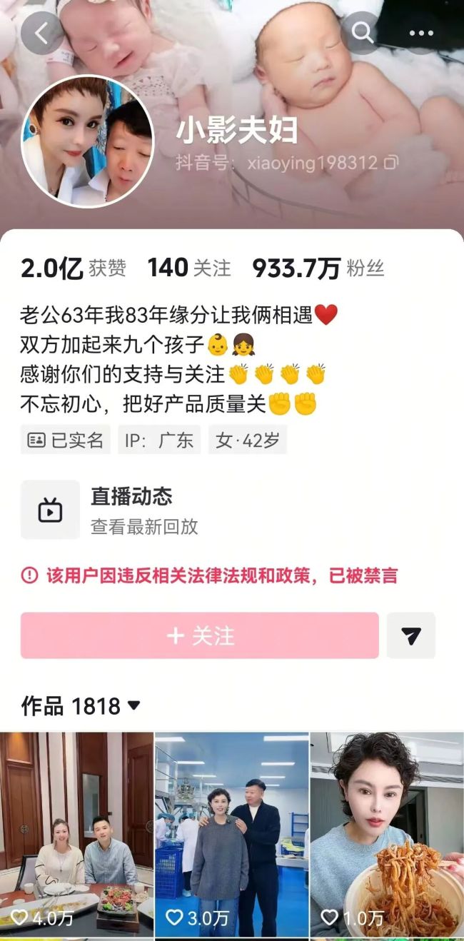 随后小影夫妇的抖音账号被迅速封禁,无法再进行关注。