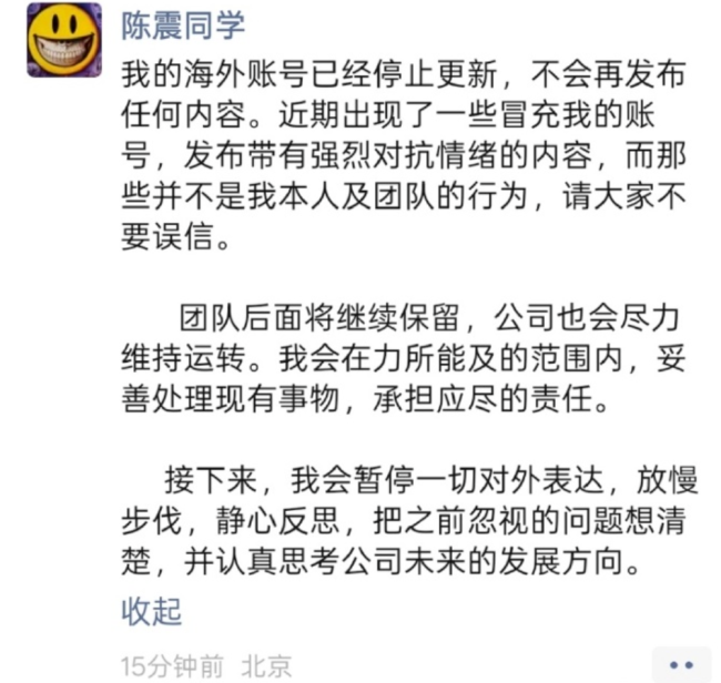 12月7日,陈震在朋友圈发文回应此事,宣布已经停更海外账号,接下来将暂停一切对外表达,静下心来好好进行自我反思。