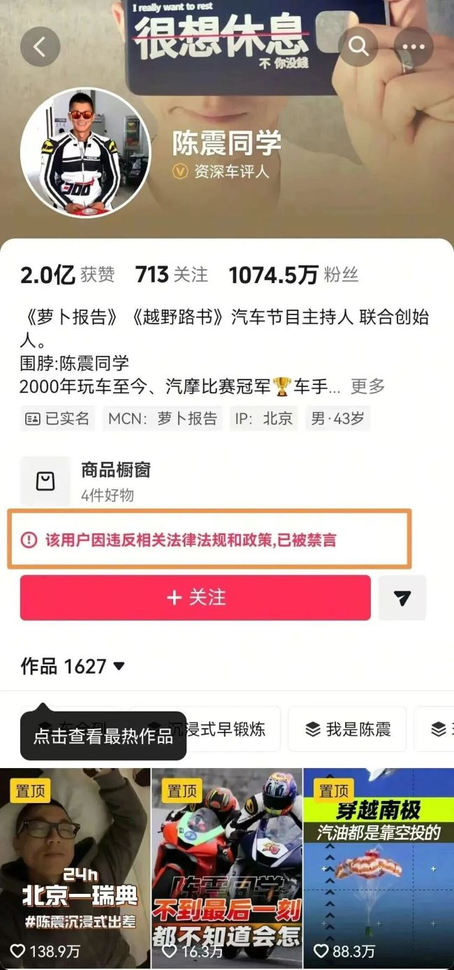 而在偷税事件大范围传播开前,他的抖音、微博、小红书、B站等多个平台账号陆续被禁言和封禁,品牌纷纷终止商业合作进行切割,人设崩塌的陈震彻底陷入“社会性死亡”的困境。