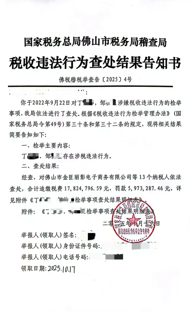 今年10月,全网坐拥千万粉丝的网红小影夫妇被当地税务局查处,确认其 存在涉税违法行为, 对佛山市金臣丽影电子商务有限公司等13个纳税人依法查处,合计追缴税费1782万元,罚款597万元。