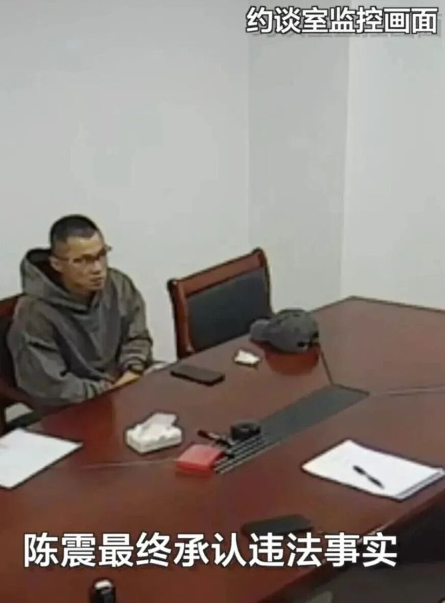 近日,央视还曝光了陈震被约谈时的监控画面:只见他身穿灰色上衣,拘谨瑟缩地坐在椅子上,面部神情尽显心虚,与往日意气风发的模样完全不同。