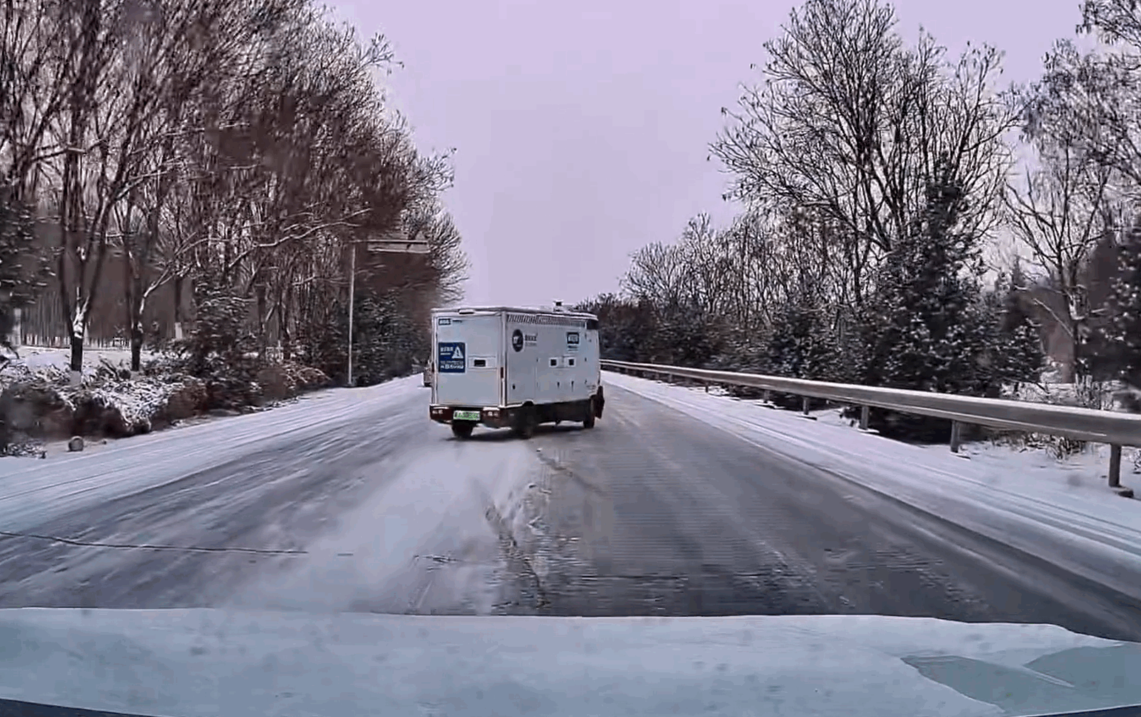 因为一边滑行,车辆还一边在加速,导致这辆无人快递车直接横过来。随后,无人车又反打方向,将车辆救了回来,但车辆的稳定系统不足以应对这种冰雪路面,车辆几乎像螃蟹一样斜着走。