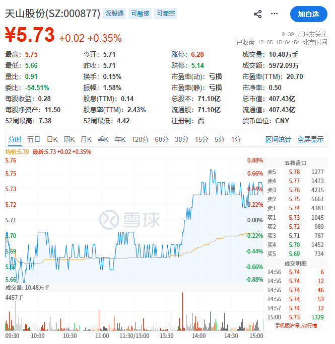 二级市场上,截至12月5日收盘,天山股份涨0.35%,报5.73元/股,总市值407.4亿元。