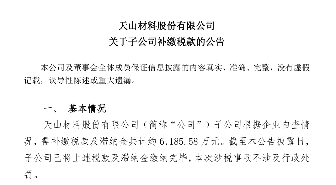 12月5日盘后,天山股份公告称,公司子公司根据企业自查情况,需补缴税款及滞纳金共计约6185.58万元。截至本公告披露日,子公司已将上述税款及滞纳金缴纳完毕,本次涉税事项不涉及行政处罚。