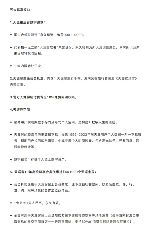 天涯客公司在征得天涯社区公司认可的基础上,推出“新天涯创世成员产品服务包”,招募9999位创世成员,成为新天涯的共建者与天涯社区重启者。