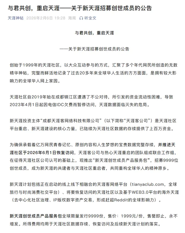 为确保承载着亿万网民青春记忆、原创内容和人生梦想的宝贵数据完整存续,并推进天涯社区于2026年6月1日恢复访问。