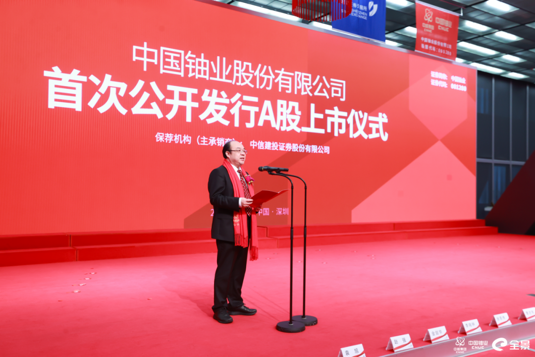 王进军代表国家原子能机构向中国铀业成功上市表示热烈祝贺。他强调,站在新的历史起点上,希望中核集团及其所属的中国铀业,牢记职责使命,充分发挥市场赋能优势,以“市场”为舵,以“资本”为帆,不断加大科技创新力度,持续提升综合治理效能,在天然铀领域实现资源效益、经济效益、环境效益、社会效益齐丰收,为保障我国能源资源安全,支撑国民经济高质量发展再立新功。