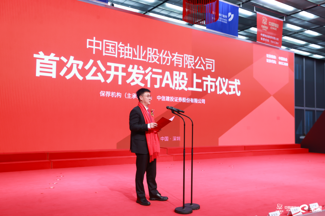 上市仪式现场,中核集团总经理、党组副书记张涛,国家原子能机构系统工程司副司长王进军,中核集团党组成员、总会计师王学军,中核集团党组成员、副总经理陈军利,国家产业基金董事长曲克波,中国国新控股有限责任公司党委书记、董事长徐思伟,中信建投证券股份有限公司党委副书记、总经理金剑华,中国铀业党委书记、董事长袁旭一同为中国铀业敲钟开市。中国矿业联合会党委书记、会长程利伟,中国核能行业协会常务副理事长曹述栋,深圳证券交易所党委委员、副总经理李鸣钟,保荐人(主承销商)团队、股东与公司管理层代表、中介机构代表以及媒体记者等共同见证了这一时刻。