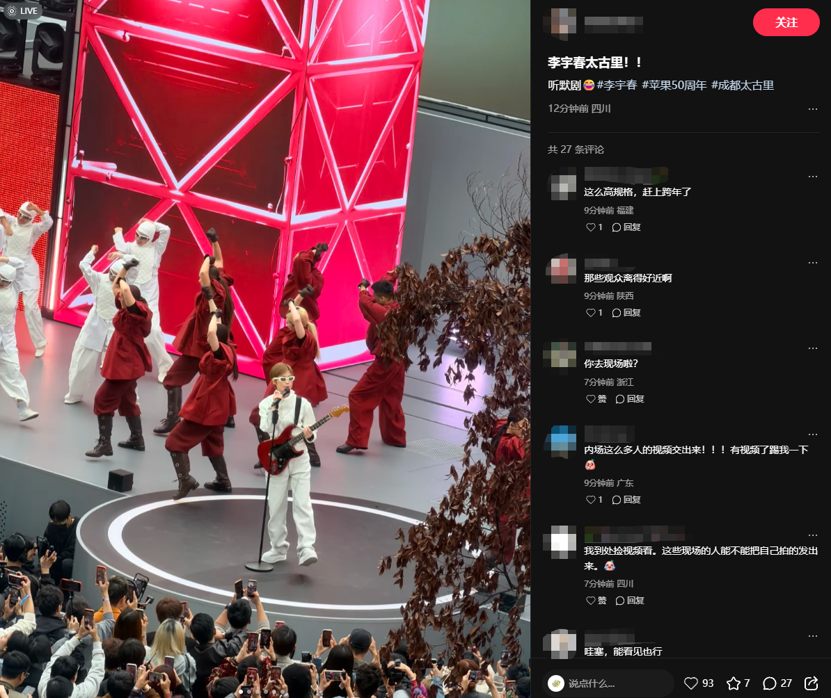 成都是苹果50周年庆祝活动的全球第二站,第一站是3月13日苹果在纽约中央车站的Apple Store,邀请了17次格莱美奖得主Alicia Keys登台表演,库克现身助阵。