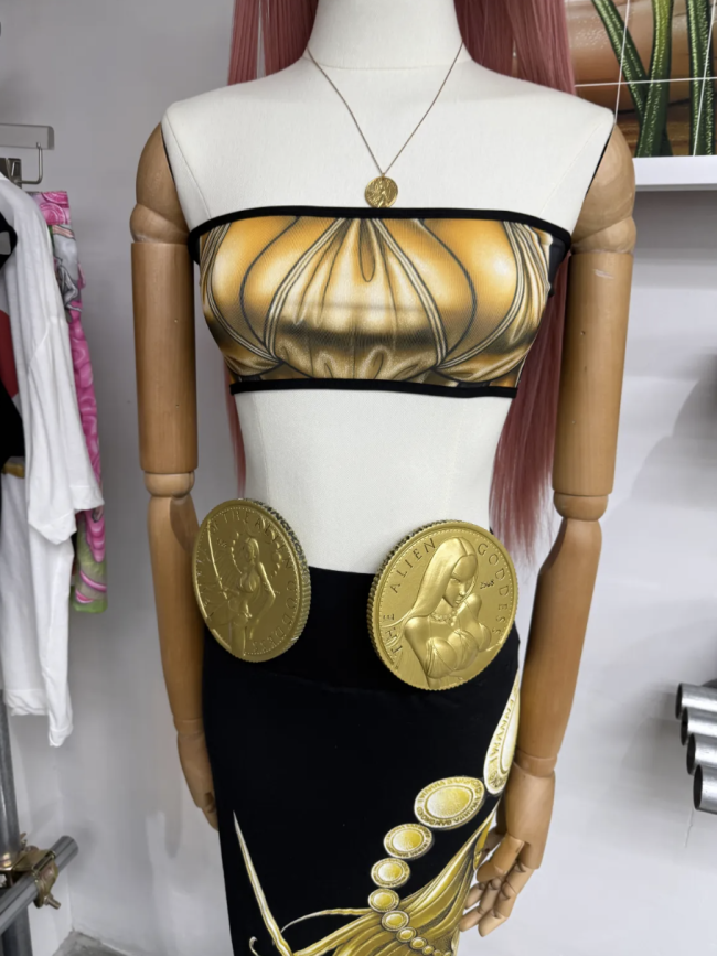 这是一套未来感十足的镂空套装。露肤度极高但又控制恰到好处。