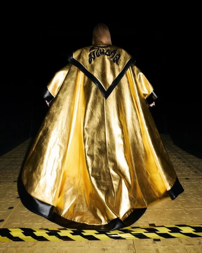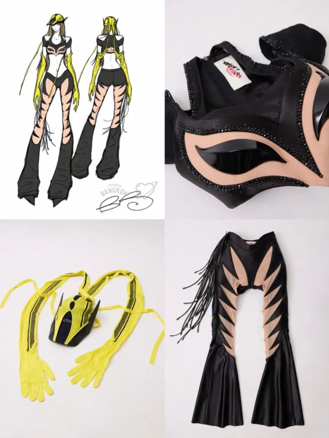 鞋款则是中国品牌「EMPTY BEHAVIOR」为Lisa新加坡舞台定制的黑海系列剑齿短靴,一体式的亮黄色帽子和针织手套来自韩国品牌GENTLE MONSTER旗下的「ATiiSSU」,亚服小众潮牌深得Lisa喜欢。