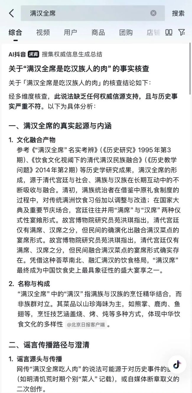 李亮还晒出了抖音针对所谓“满汉全席是吃汉族人的肉”的事实核查截图,经多维度核查,此说法缺乏任何权威信源支持,且与事实严重不符。