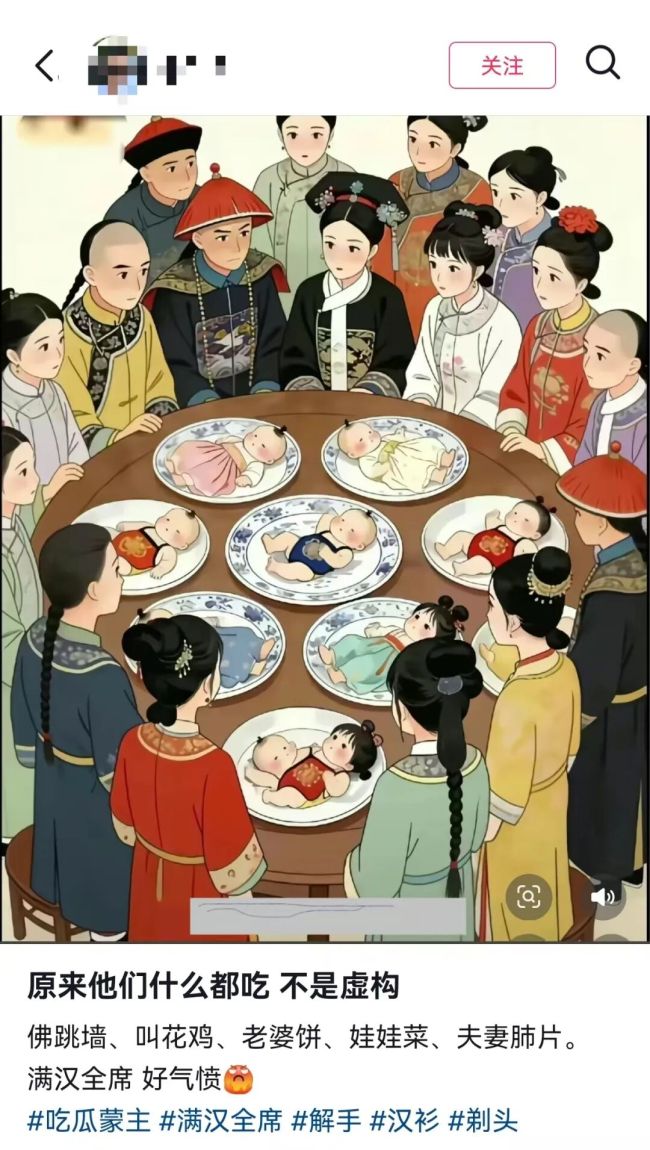 还有人发布相关图片,将“满汉全席是吃人(小孩)”的离谱说法具象化。