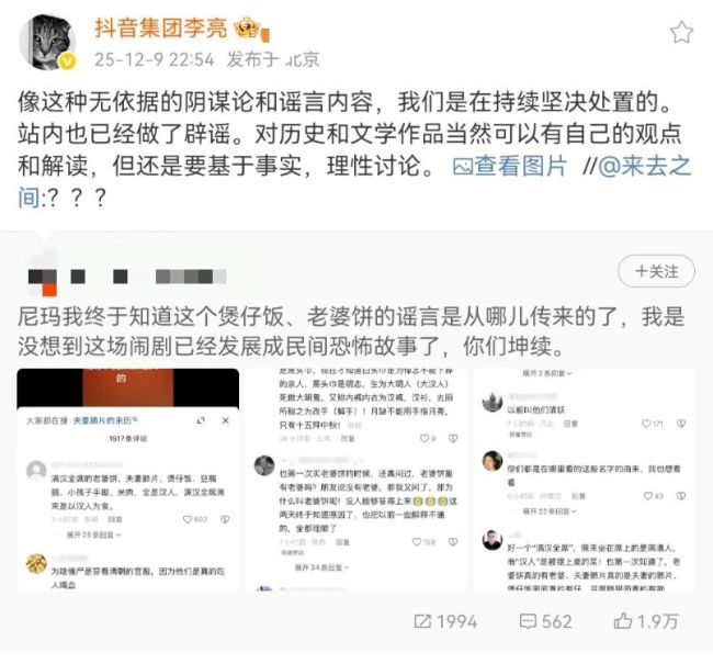 12月9日,抖音集团副总裁李亮转发上述微博并强调,这类无依据的阴谋论和谣言内容,抖音一直在持续坚决处置,站内也已经做了辟谣。“对历史和文学作品当然可以有自己的观点和解读,但还是要基于事实,理性讨论”。