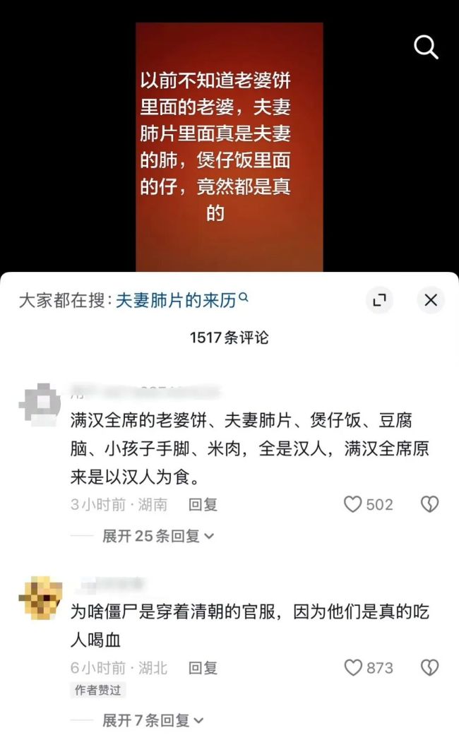 但更令人意外的是,在如此离谱的内容下,竟然还有不少网友信以为真,评论称“满汉全席原来是以汉人为食”、“僵尸穿着清朝官服是因为他们真吃人喝血”。