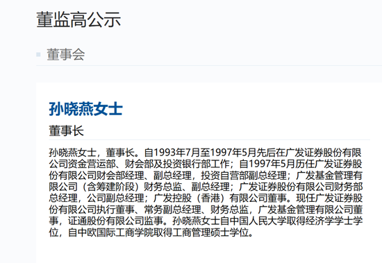 新任董事长是孙晓燕女士。她是一位在金融行业摸爬滚打多年的“老将”,从1993年就加入了广发证券,可以说是公司的元老级人物。