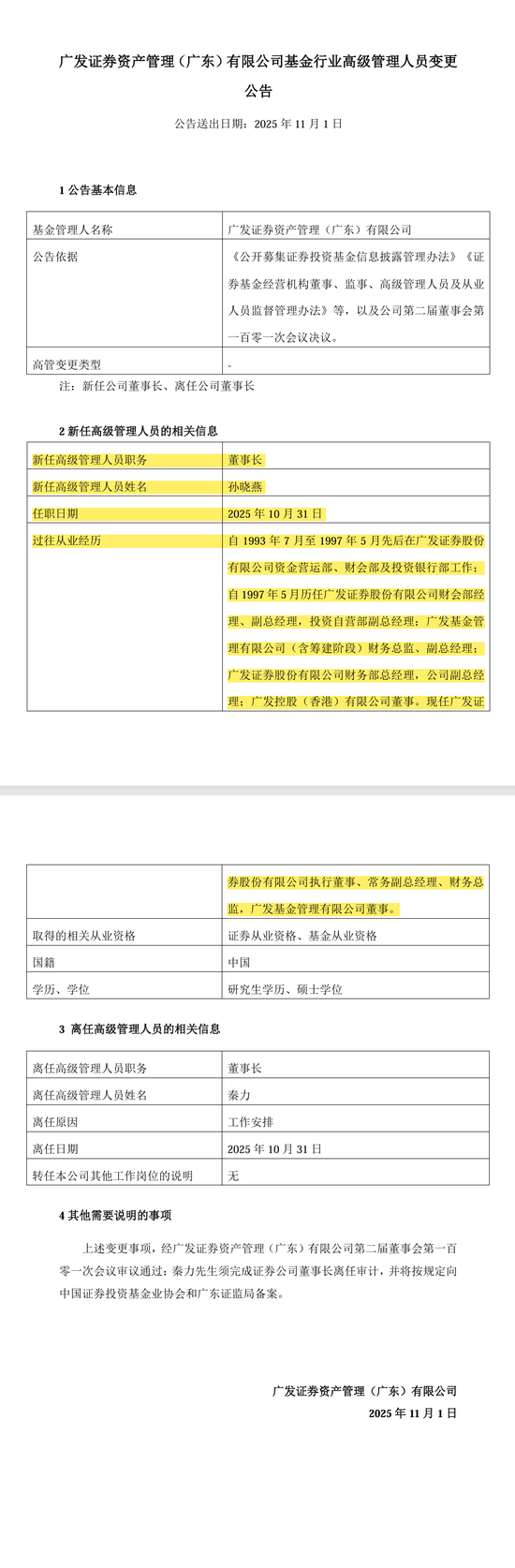 广发证券资产管理公司完成了一次高层交接棒,经验丰富的女高管孙晓燕正式接掌董事长职位,而原董事长秦力则能更专注于管理整个广发证券集团。这次人事变动属于公司内部正常的岗位调整。