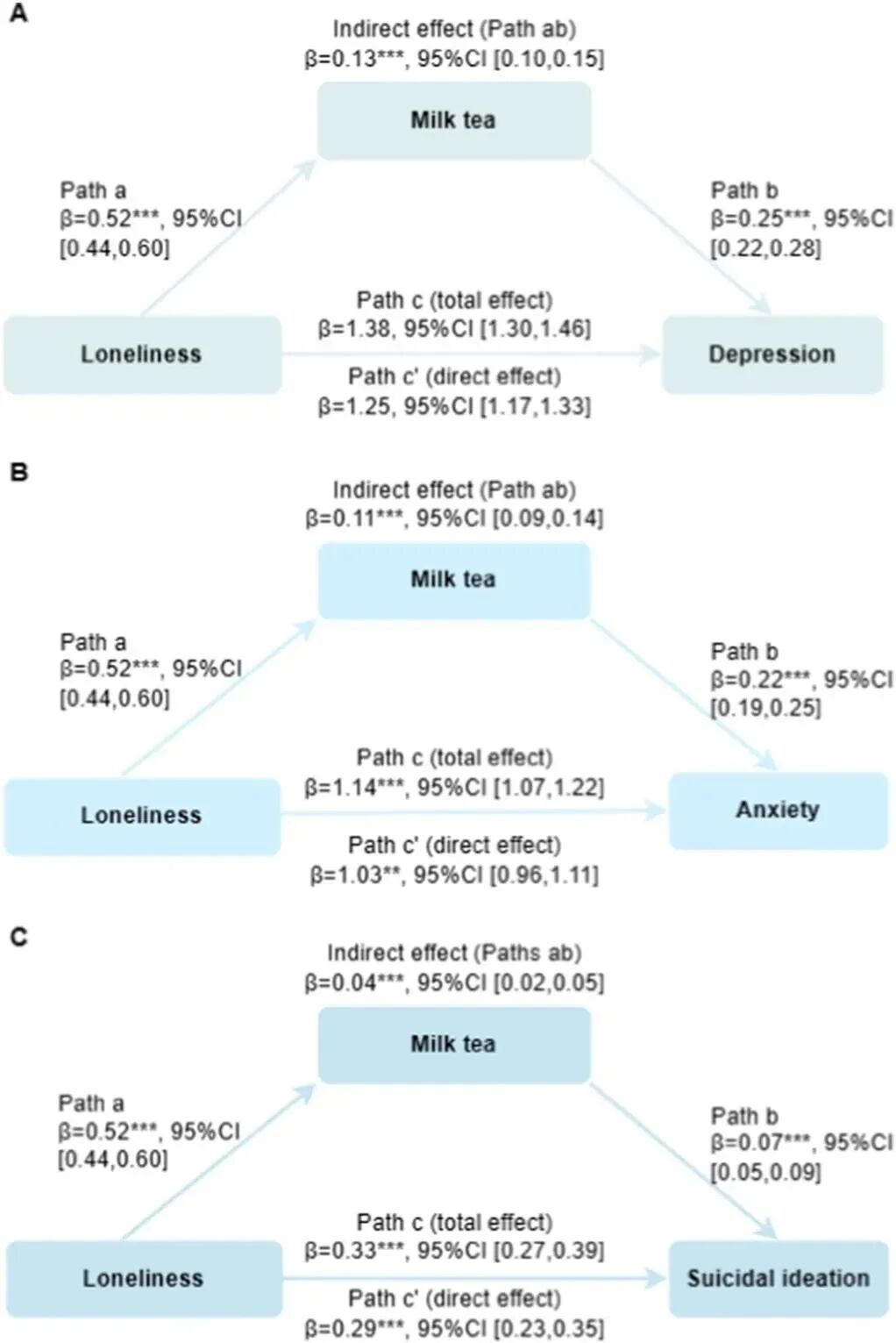 这意味着,孤独感可能通过增加喝奶茶的频率,间接提高了抑郁、焦虑和自杀观念的风险。这一观点为心理健康干预措施提供了一个可能的新方向,即通过减少奶茶成瘾来间接改善心理健康。