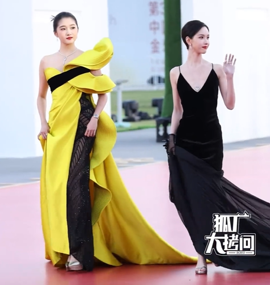 但当黑色深V丝绒修身礼服裙的陈都灵和大黄大黑的关晓彤携手走红毯时。