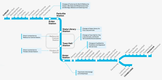 Metro Tunnel开通后,Sunshine至Cranbourne/Pakenham实现一站直达,无需换乘。