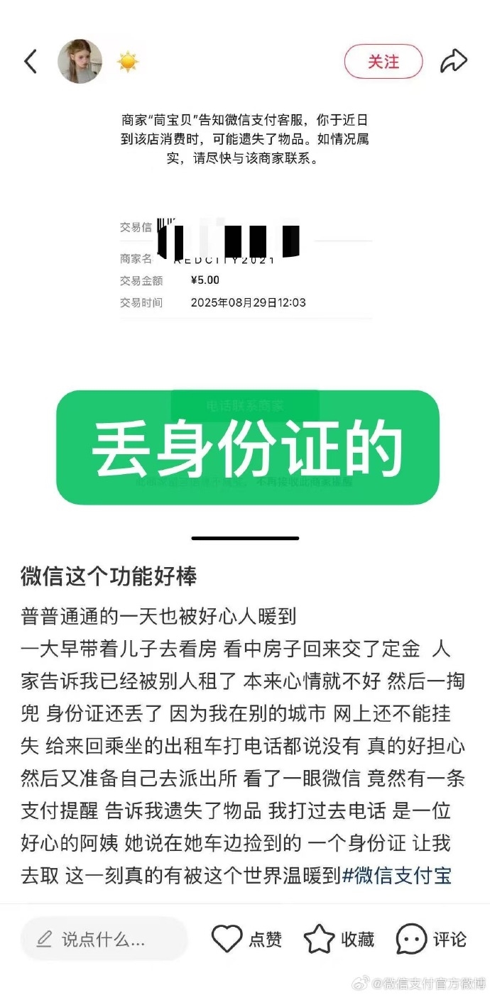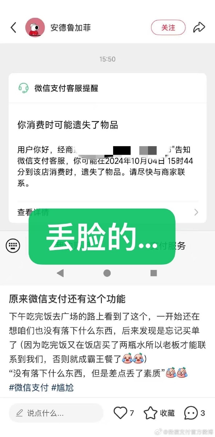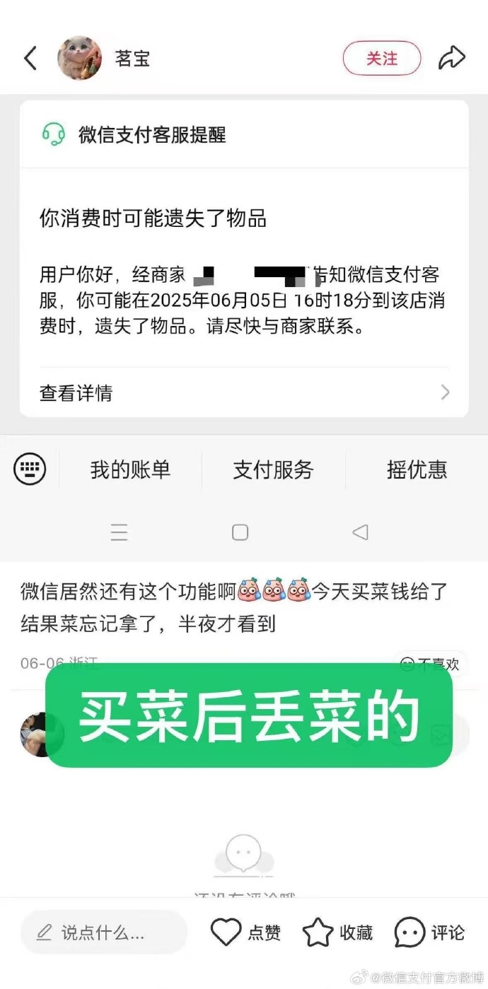 如果丢东西了 商家现在可以通过微信的客服提醒你 Source 近日,微博话题#第一次知道微信支付还有这功能#登上热搜。如果你使用微信支付付款,如果丢东西了,商家可以通过微信的客服提醒你。 接收的内容为:“商家‘XX’告知微信支付客服,你于近日到该店消费时,可能遗失了物品,如情况属实,请赶快与商家联系。” 据了解,这是微信支付的“遗失提醒”功能,今年8月也曾登上过热搜。 从网友分享的案例来看,遗失物品可谓“无奇不有”—— 有人在沙县小吃遗失了新买的内裤,有人看房后丢失身份证,还有人买菜忘记拿商品、付款时多付20元被商家通过该功能提醒退回。 更有网友险些因忘记买单酿成“霸王餐”,多亏商家通过消费记录联系,既挽回了损失也保住了体面。