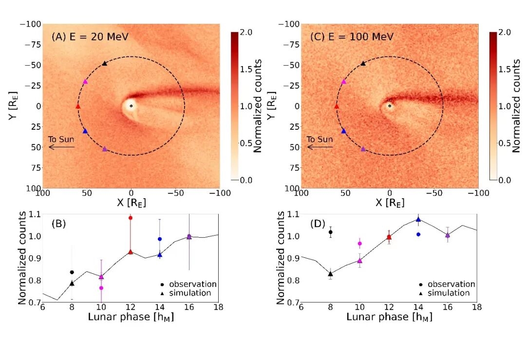 上图中, (A) 和 (C) 分别展示了 20 MeV 和 100 MeV 质子在地月空间中的银河宇宙线归一化计数率模拟分布。(B) 和 (D) 分别呈现了对应能量下沿月球轨道的归一化计数率随月相的变化,其中三角形表示模拟结果,圆点表示实际观测结果。模拟成功复现了观测中宇宙线通量降低的空间区域,从而验证了银河宇宙线空腔结构的存在。
