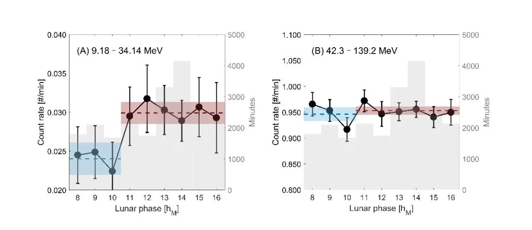 如上图,在稳定行星际磁场和太阳风条件下,不同轨道位置(由晨侧至昏侧)银河宇宙线平均计数率的变化特征。低能通道(9.18–34.14 MeV)中银河宇宙线通量下降尤为显著,其平均值在月相=8–10 hM区域明显低于月相=11–16 hM区域。直方图表示在稳定条件下,每个月相区间内的累计采样时间。虚线表示对应区间的平均计数率,阴影矩形表示±1σ不确定度范围。