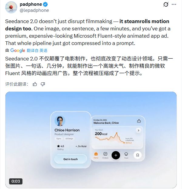 更“接地气”的应用也出现了。有网友演示,只用一张图片和一句描述,几分钟内就做出了一个高端、流畅的微软Fluent设计风格的应用广告动画。动态设计领域的门槛,似乎也被瞬间踏平。