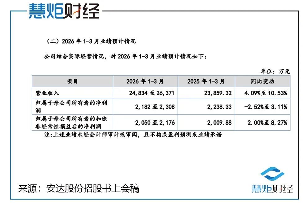 安达股份还预计2026年1-3月营业收入最高达到2.64亿元,同比增长10.53%;预计扣非净利润最高2,176万元,同比增长8.27%。