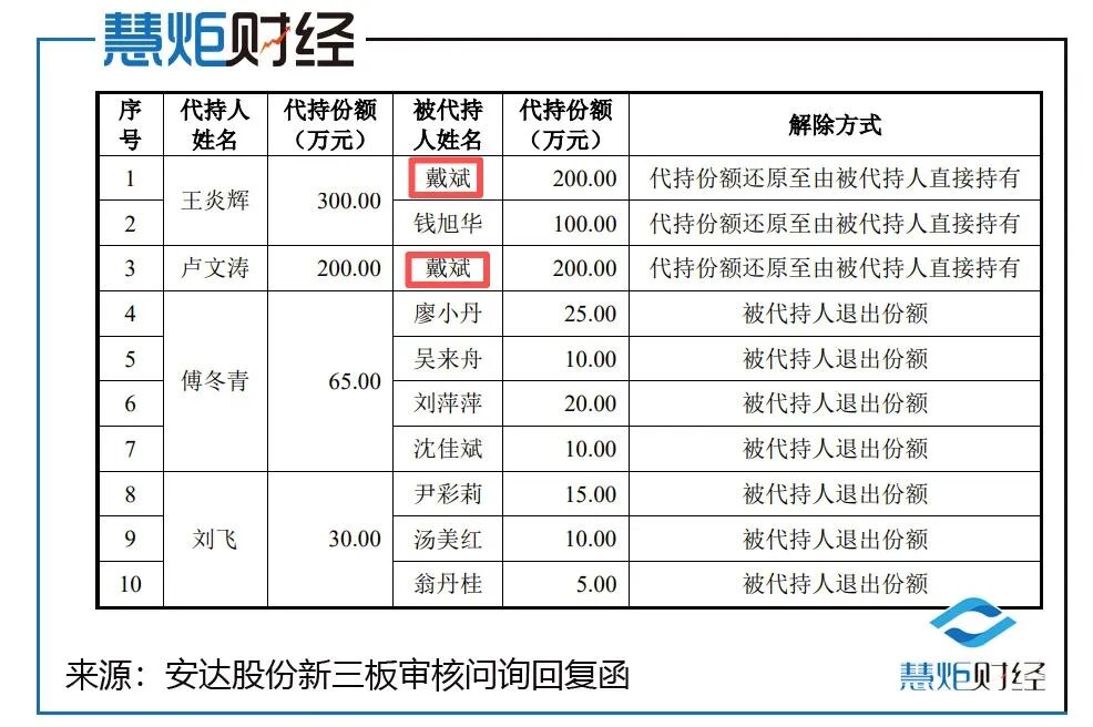 慧炬财经梳理发现,2020年12月,戴斌做为外部投资者通过现任安达股份董事、副总经理王炎辉以及副总经理卢文涛代持有安达有限股权(分别代持200万元)间接持有公司1.0262%股权。