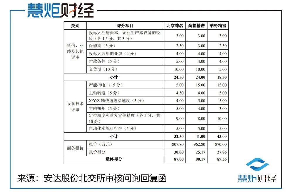 在回复函中,安达股份提供了尚善精密中标变速箱产品加工线项目的具体评分表格,慧炬财经透过尚善精密中标得分拆解对比发现,尚善精密最终得分90.17分,北京绅名87.00分,纳野精密89.36分,尚善精密为最高分,从形式上符合"得分最高者中标"的招投标规则。