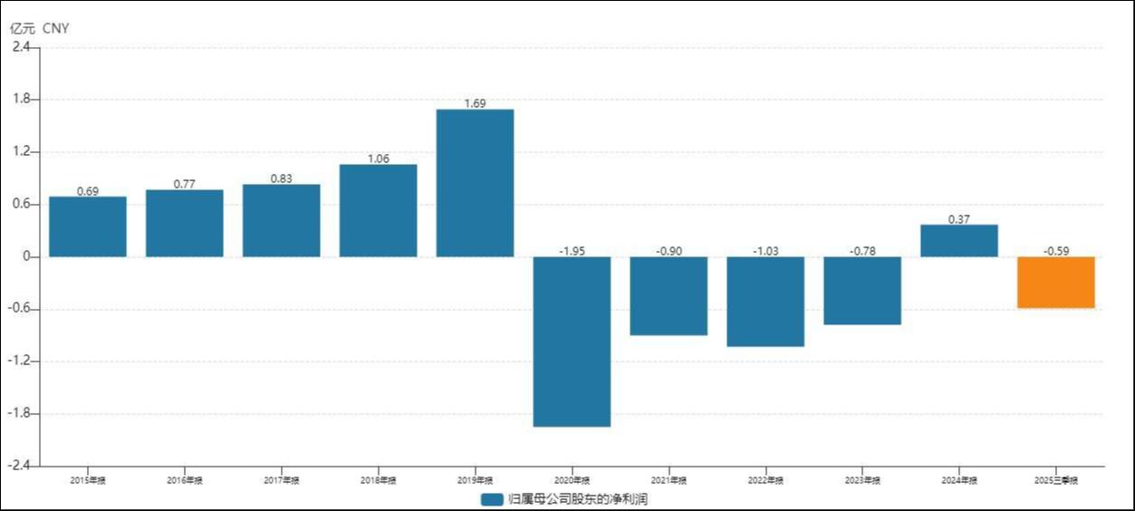 但这些调整并未让公司摆脱股权争斗阴霾,业绩持续承压,股价也一路走低。财报显示,2020年-2023年,公司连续4年亏损合计4.66亿元。2024年尽管小幅扭亏,2025年再现颓势,今年前三季度公司亏损0.59亿元。