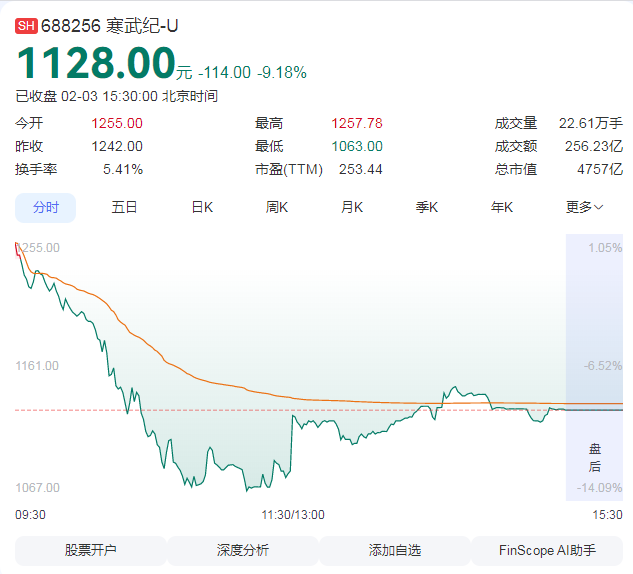 午后,寒武纪股价跌势有所收窄,最终收盘报1128.00元,跌幅定格在9.18%。