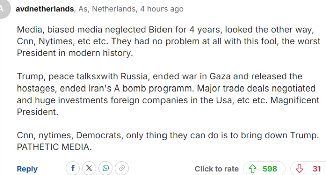 不少网友看完拜登这段口误后也是一片无语,有网友直接把两任总统对比起来:川普时期推动美俄谈判、促成加沙停火与人质交换、压下伊朗核计划、谈成大规模贸易协议、吸引外资——这些在欧美保守派眼中都是实打实的政绩。反观如今的媒体和民主党,似乎除了攻击川普,什么也做不了。“可悲的媒体”。