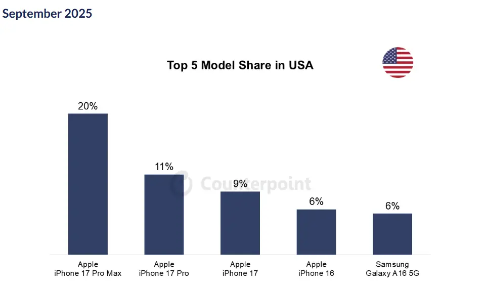 目前来看,苹果的iPhone 17系列在美国本土和关键的中国市场上都大获成功。数据显示,iPhone 17 Pro Max和iPhone 17 Pro分别位列中美9月最畅销智能手机榜前二。