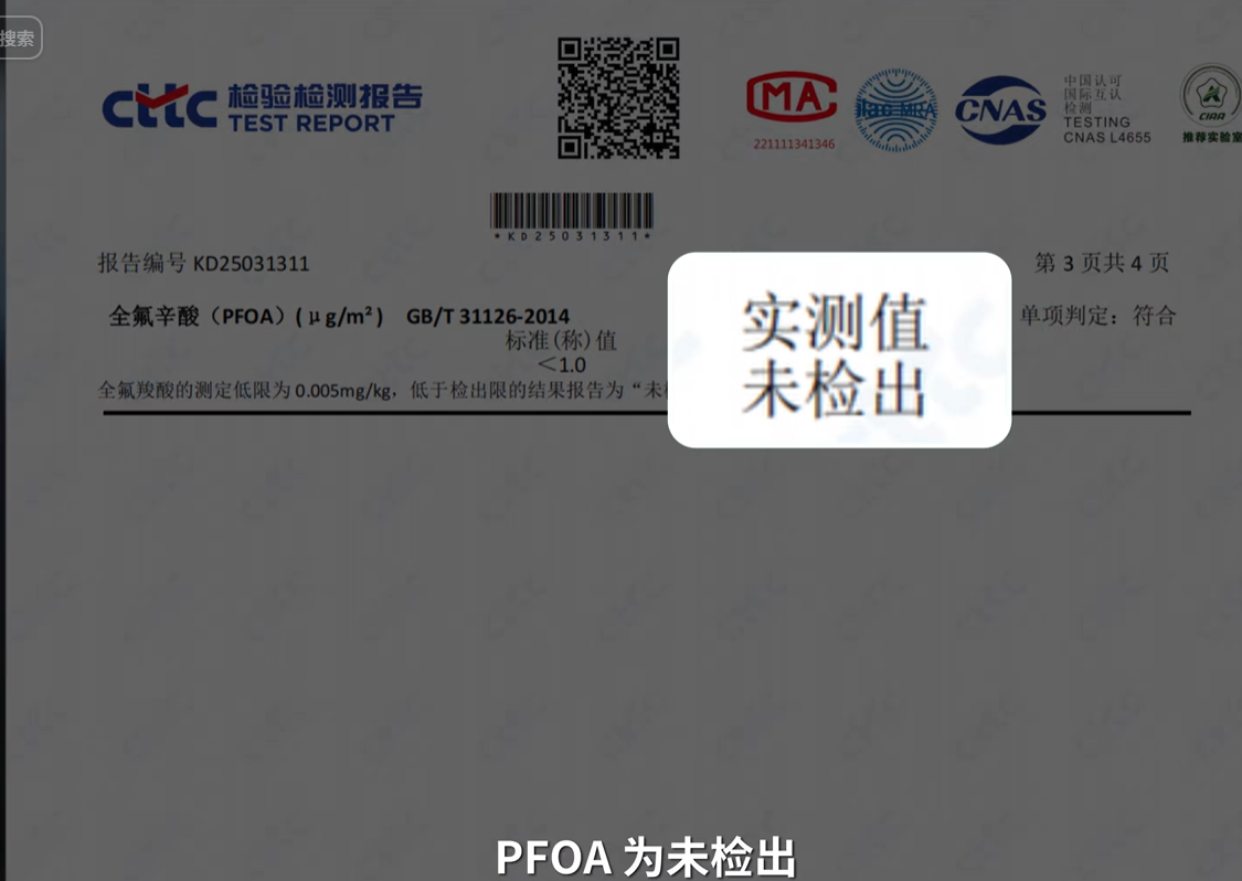 对于该质疑,影视飓风的回答是没有,因为他们有完整的检测报告可以直接放出,能明确看到他所提到的所谓致癌物PFOA为未检出。