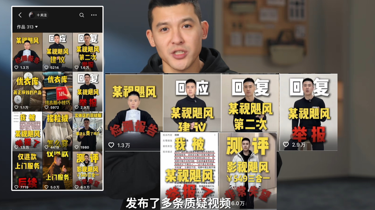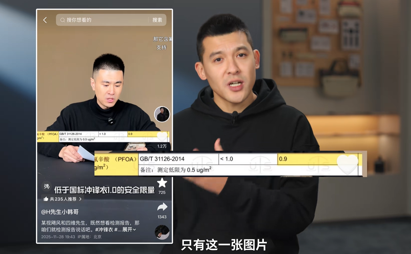 第一条指控:此博主质疑影视飓风的冲锋衣有致癌风险。