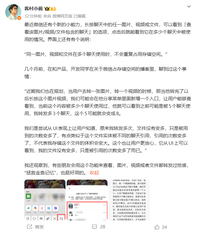微信员工表示,这一功能的设计早有规划,核心是通过UI层面的展示,让用户直观了解到文件转发后只是引用次数增加,并非生成了多个副本,实际存储体积并未变大。