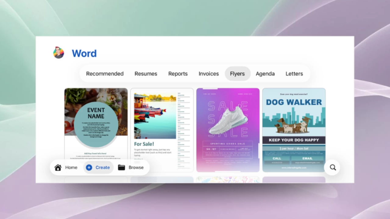 同时浮动栏现在包含“主页”、“创建”和“浏览”等标签,使得导航更加清晰,并且用户在创建新文档时,可以直接利用筛选功能在“传单”、“简历”、“发票”等不同类别间快速切换和搜索,告别以往冗长的模板列表。