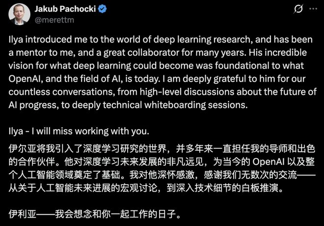 Jakub在Ilya的推文下留言,称其为自己的导师和出色的合作伙伴,并称会想念和Ilya一起工作的日子。