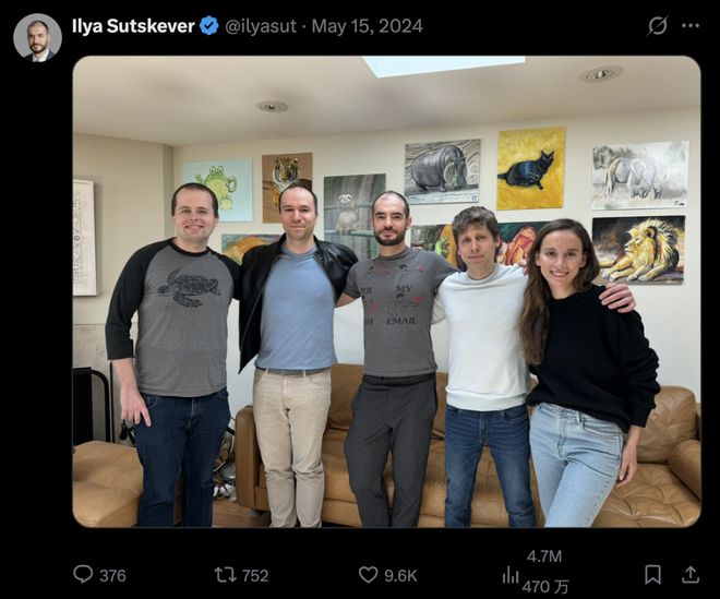 在2023年主导了那场罢免奥特曼OpenAI CEO职务的行动之后,2024年3月,Ilya宣布了离开OpenAI的消息,他还在X平台上晒出了与Jakub等人的合照。